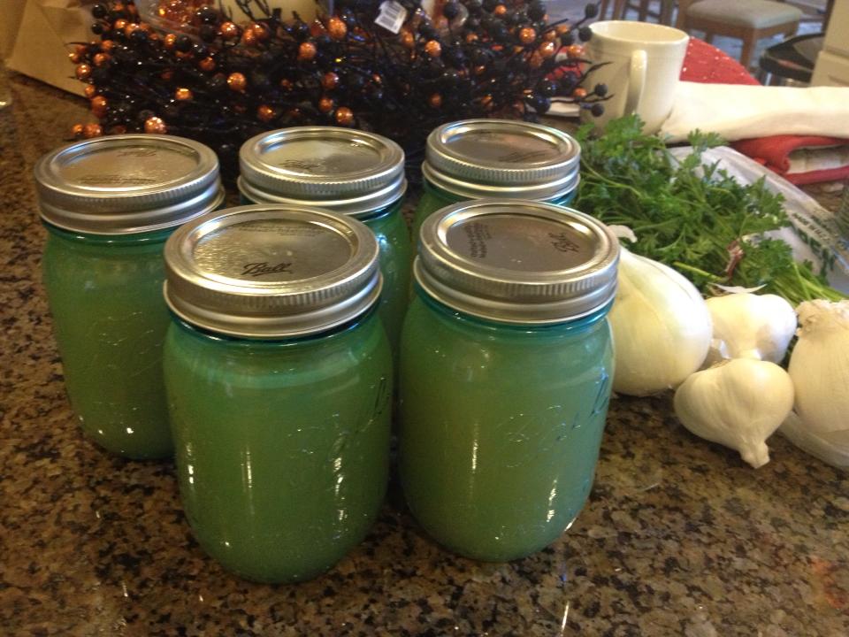 I usually find that with poultry, the bone broth is delicious in 12 hours (although cooking it longer certainly doesn’t hurt anything and brings out more of the flavorful marrow), but the beef bones generally take 24 hours or longer to get a rich tasting broth. When your broth is done cooking, remove all vegetables and bones. Then strain through a sieve. You can strain through cheesecloth if you prefer to get all the herbs out of the broth, but I’ve found that this removes a lot of the gelatin, which contains a lot of the nutritional value we want in our bone broth.
