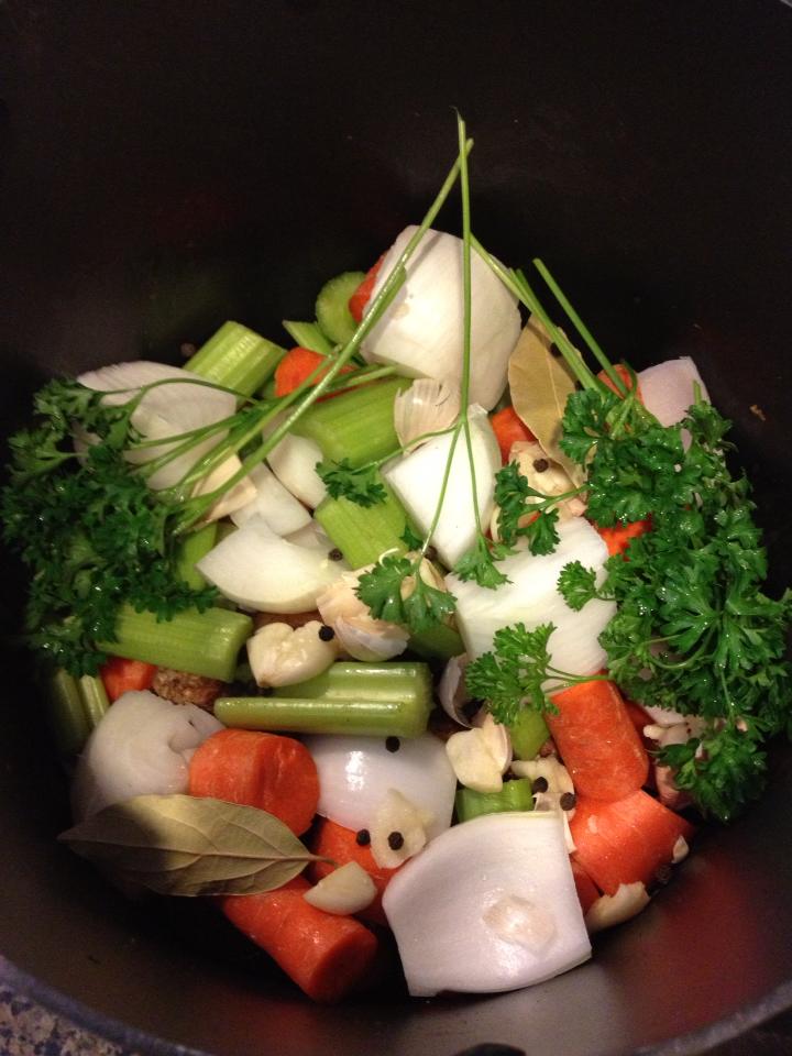 Put all of the above ingredients into your crockpot, and then cover with filtered water so that the bones/veggies are covered 1-2 inches above them. Cook on low for 12-24 hours. Don’t salt while cooking, wait until you use the broth as it condenses as it cooks 🙂
